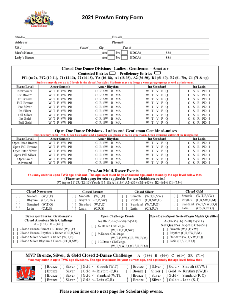 2021 Pro/Am Entry FormStudio Address: City: Men Name: Lady's Name:State:Zip Am Email: Phone# Fax # Pro NACA# Pro NACA#SS# SS#Closed One Dance Divisions Ladies Gentleman Amateur Contested Entries Proficiency