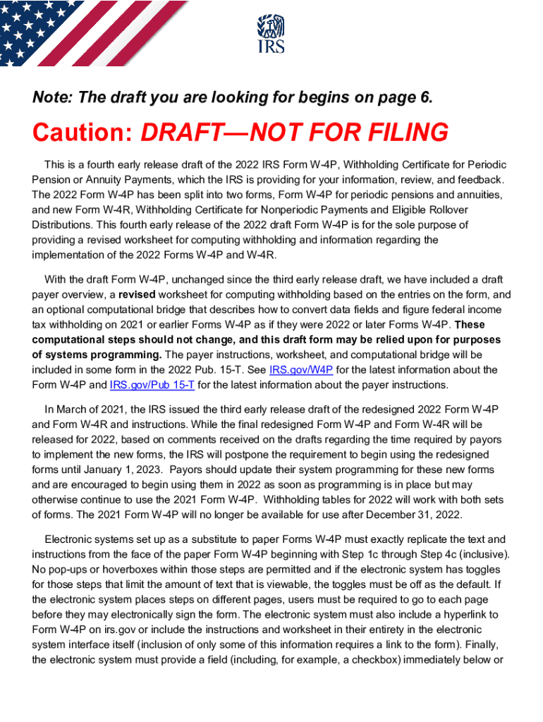 Note: The draft you are looking for begins on page 6. Caution: DRIFTNET FOR FILING This is a fourth early release draft of the 2022 IRS Form W4P, Withholding Certificate for Periodic Pension or Annuity