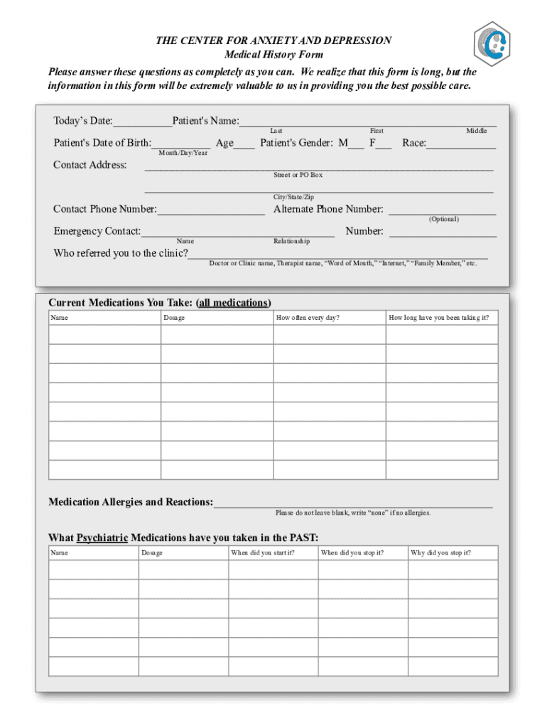 THE CENTER FOR ANXIETY AND DEPRESSION Medical History Form Please answer these questions as completely as you can. We realize that this form is long, but the information in this form will be extremely