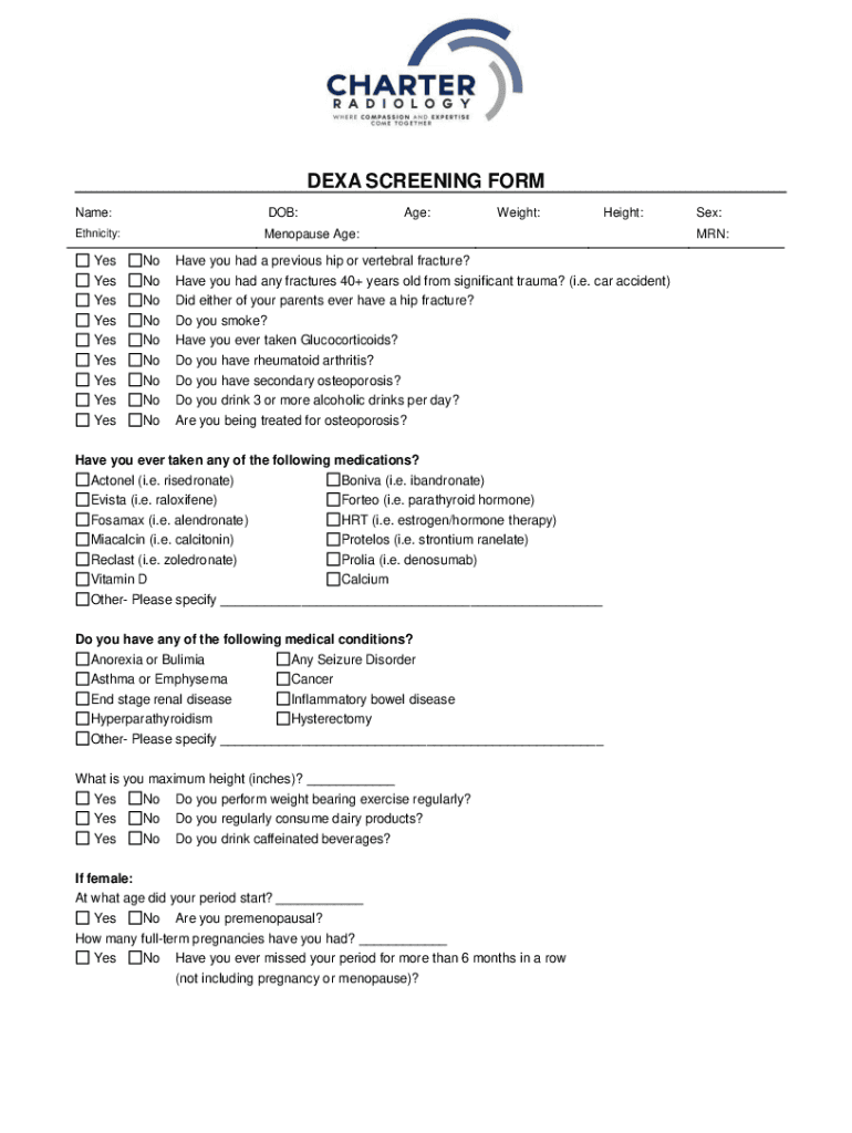 Get the free DEXA SCREENING FORM - Charter Radiology