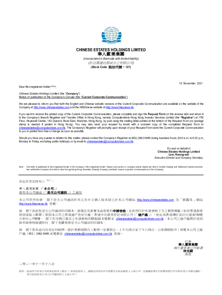 CHINESE ESTATES HOLDINGS LIMITED (Incorporated in Bermuda with limited liability) () (Stock Code 127)18 November 2021 Dear Nonregistered holder (Note), Chinese Estates Holdings Limited (the Company)