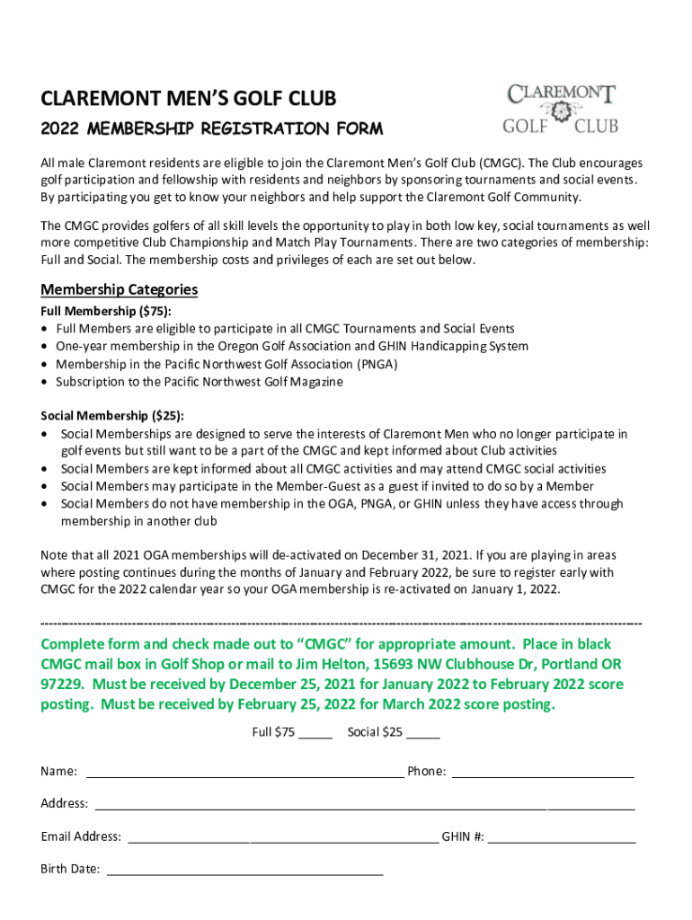 CLAREMONT MEN GOLF CLUB 2022 MEMBERSHIP REGISTRATION FORM All male Claremont residents are eligible to join the Claremont Men Golf Club (CMG). The Club encourages golf participation and fellowship