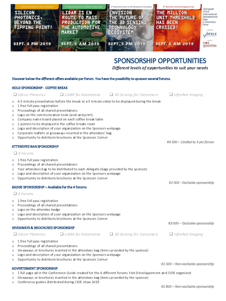 SPONSORSHIP OPPORTUNITIES Different levels of opportunities to suit your needs Discover below the different offers available per forum. You have the possibility to sponsor several forums. GOLD SPONSORSHIP