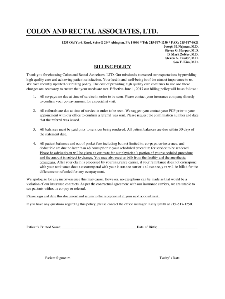 COLON AND RECTAL ASSOCIATES, LTD. 1235 Old York Road, Suite G 20 * Abington, PA 19001 * Tel: 2155171250 * FAX: 2155170821 Joseph H. Newman, M.D. Steven G. Harper, M.D. D. Mark Zebra, M.D. Steven A.