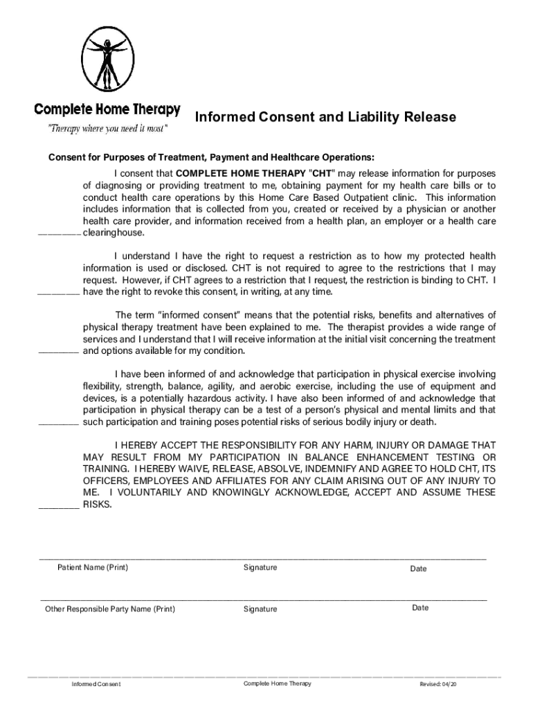 Informed Consent and Liability Release Consent for Purposes of Treatment, Payment and Healthcare Operations: I consent that COMPLETE HOME THERAPY CHT may release information for purposes of diagnosing
