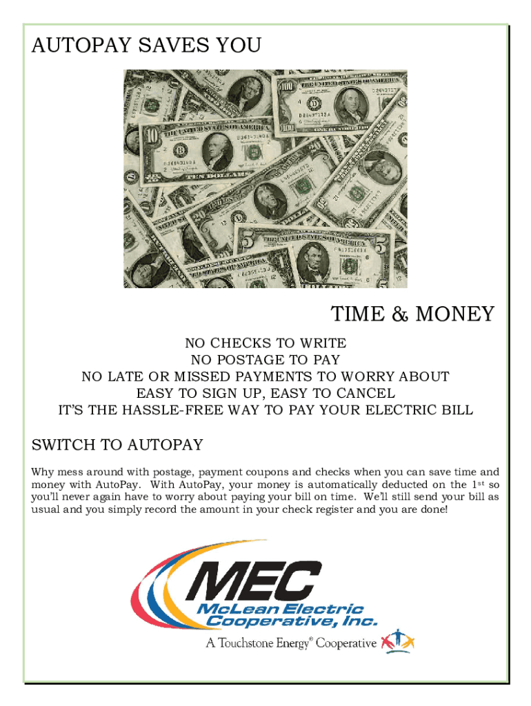 AUTOPAY SAVES YOU TIME & MONEY NO CHECKS TO WRITE NO POSTAGE TO PAY NO LATE OR MISSED PAYMENTS TO WORRY ABOUT EASY TO SIGN UP, EASY TO CANCEL It's THE HASSLE-FREE WAY TO PAY YOUR ELECTRIC BILLSWITCH