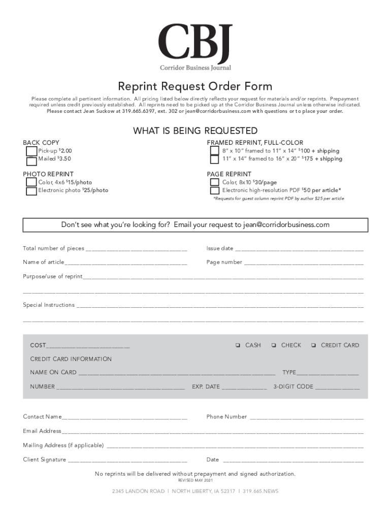 Get the free Reprint Request Order Form - assets.corridorbusiness.com