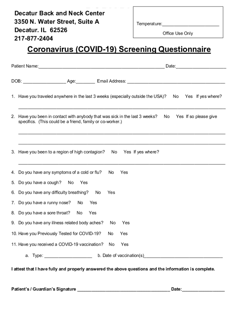 Decatur Back and Neck Center 3350 N. Water Street, Suite A Decatur. IL 62526 2178772404Temperature: Office Use OnlyCoronavirus (COVID-19) Screening Questionnaire Patient Name: Date: DOB: Age: Email