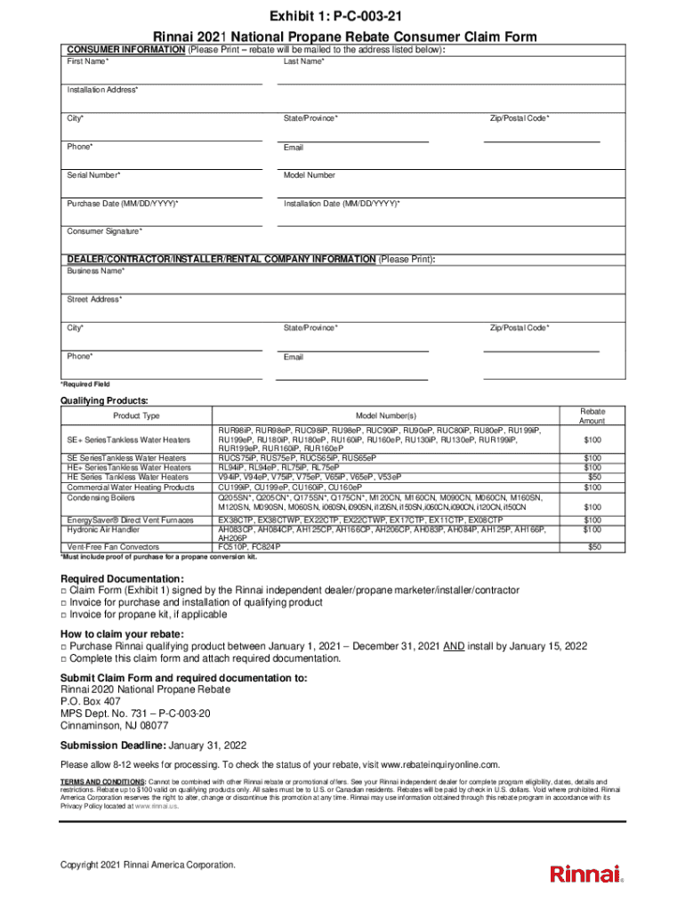 Get the free Exhibit 1: P-C-003-21 Rinnai 202 National Propane Rebate ...