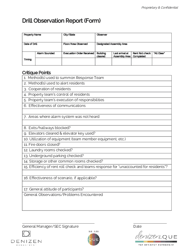 Proprietary & ConfidentialDrill Observation Report (Form) Property Amenity/StateObserverDate of DrillFloor/Area ObservedDesignated Assembly Reevaluation Order ReceivedBuilding clearedAlarm The Soundest