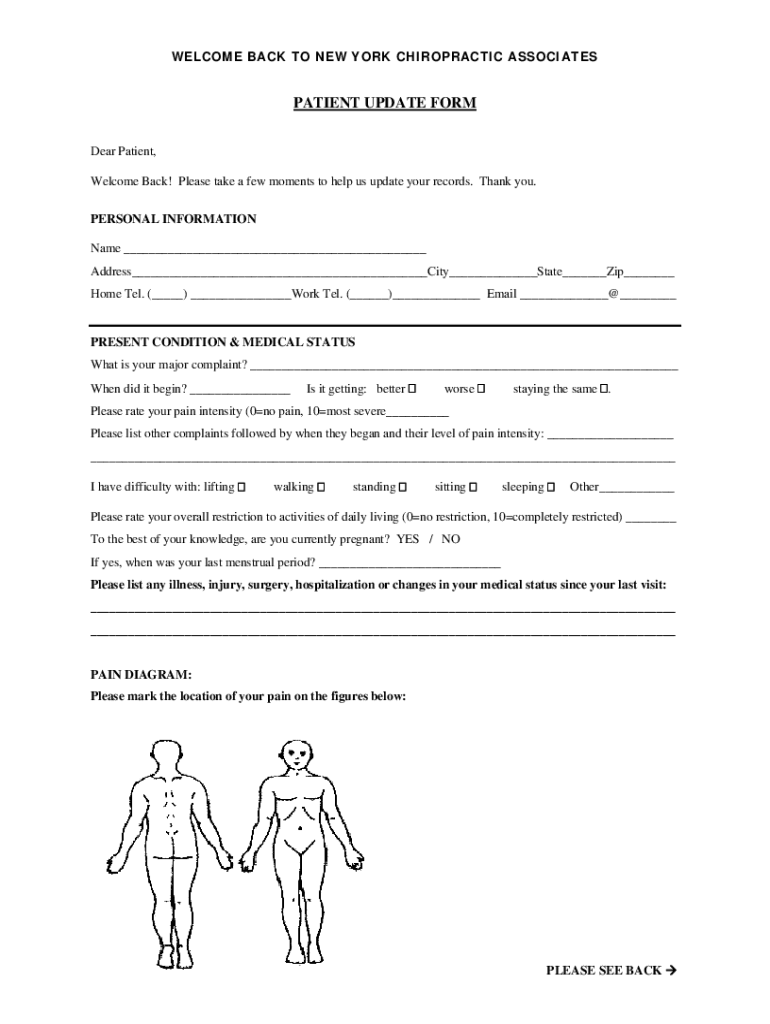 WELCOME BACK TO NEW YORK CHIROPRACTIC ASSOCIATESPATIENT UPDATE FORM Dear Patient, Welcome Back! Please take a few moments to help us update your records. Thank you. PERSONAL INFORMATION Name Address