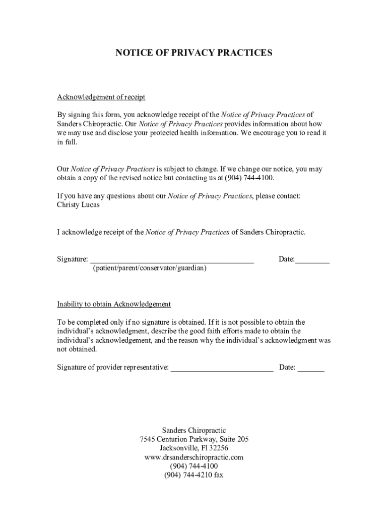 NOTICE OF PRIVACY PRACTICESAcknowledgement of receipt By signing this form, you acknowledge receipt of the Notice of Privacy Practices of Sanders Chiropractic. Our Notice of Privacy Practices provides