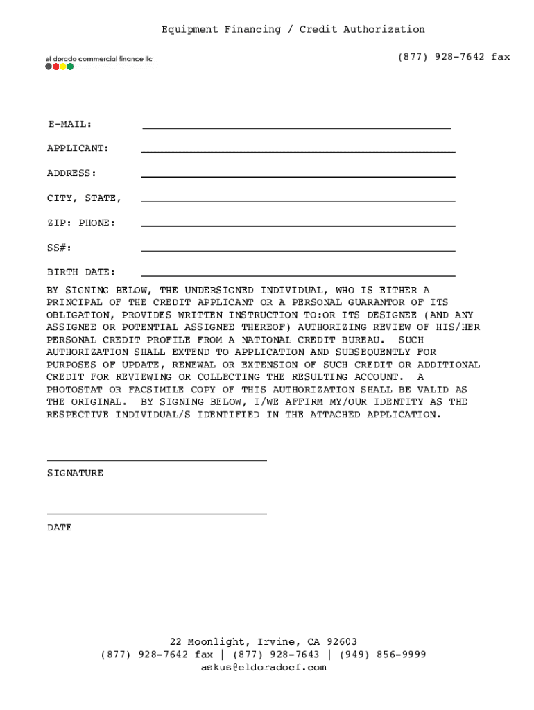 Equipment Financing / Credit Authorization (877) 9287642 email: APPLICANT: ADDRESS: CITY, STATE, ZIP: PHONE: SS#: BIRTH DATE: BY SIGNING BELOW, THE UNDERSIGNED INDIVIDUAL, WHO IS EITHER A PRINCIPAL
