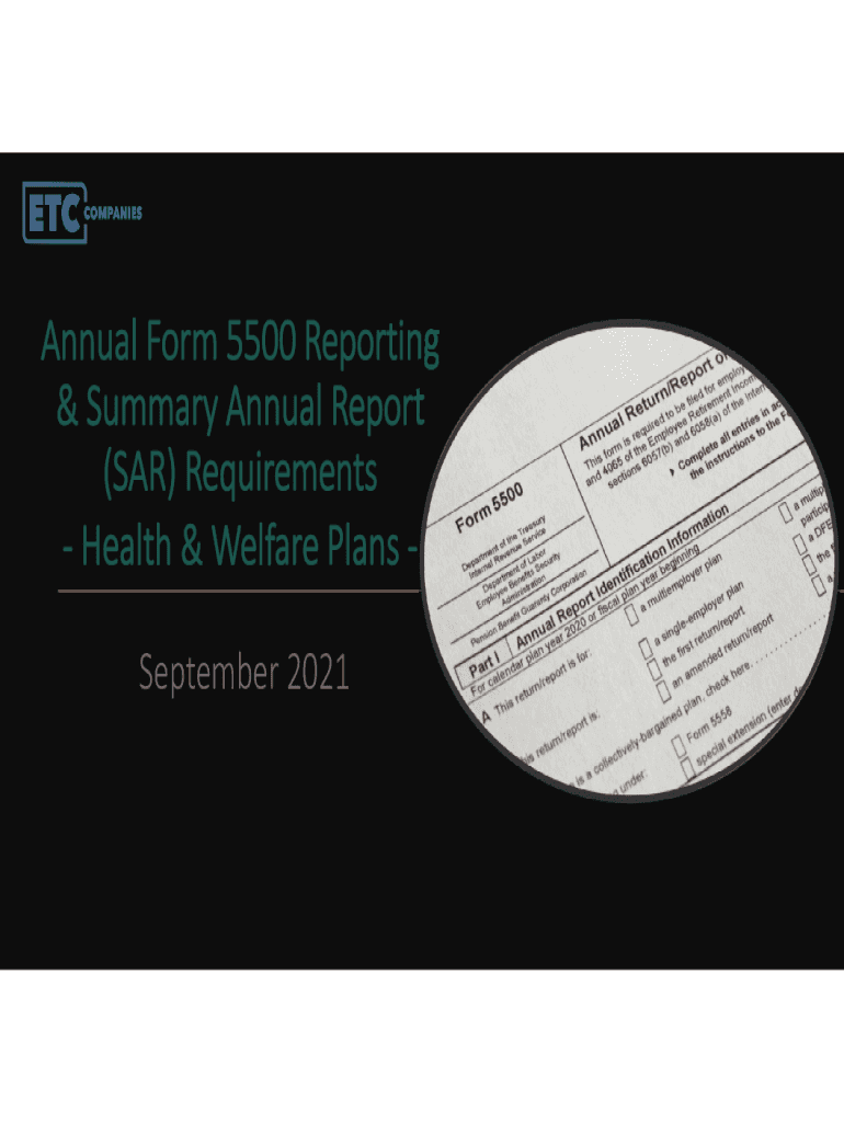 AnnualForm5500Reporting &SummaryAnnualReport (SAR)Requirements Health&WelfarePlans September2021Disclaimer Thematerialsandinformationcontainedhereinareintendedonlytoprovidegeneral informationandinnowayconstitutelegaladvice.