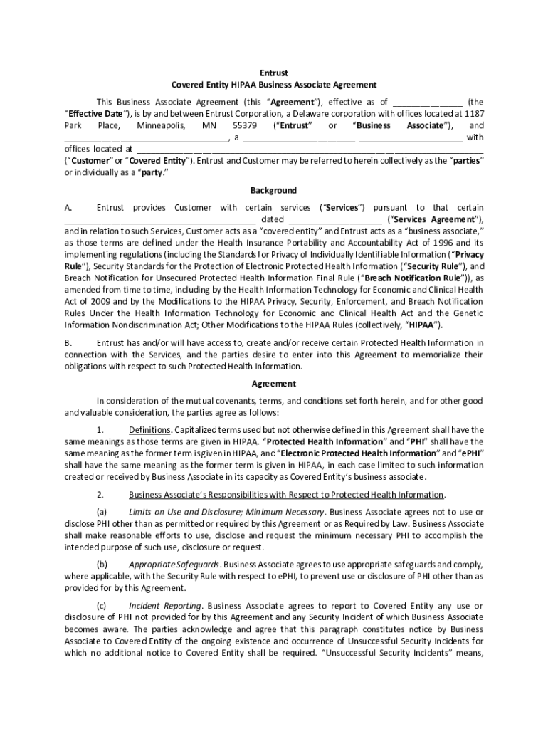 Entrust Covered Entity HIPAA Business Associate Agreement This Business Associate Agreement (this Agreement), effective as of (the Effective Date), is by and between Entrust Corporation, a Delaware