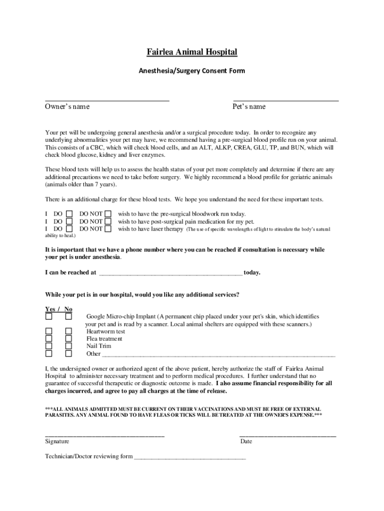 Fair lea Animal Hospital Anesthesia/Surgery Consent Form Owners name Pets numerous pet will be undergoing general anesthesia and/or a surgical procedure today. In order to recognize any underlying