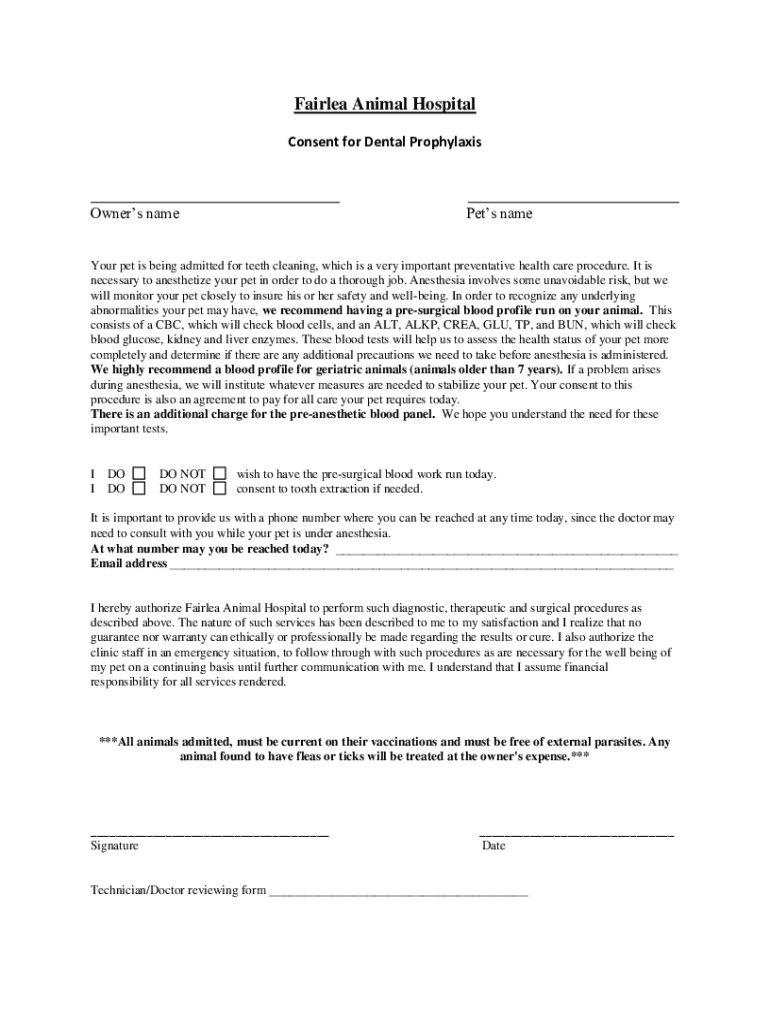 Fair lea Animal Hospital Consent for Dental Prophylaxis Owners name Pets numerous pet is being admitted for teeth cleaning, which is a very important preventative health care procedure. It is necessary