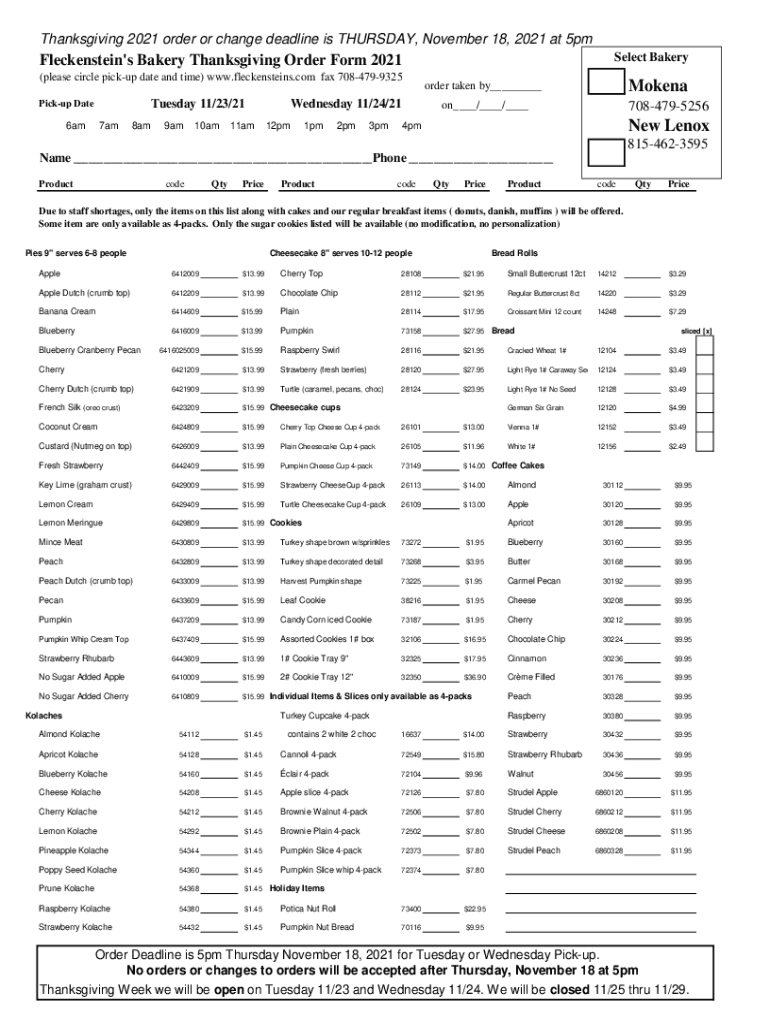 Thanksgiving 2021 order or change deadline is THURSDAY, November 18, 2021, at 5pm Select BakeryFleckenstein's Bakery Thanksgiving Order Form 2021 (please circle pickup date and time) www.fleckensteins.com