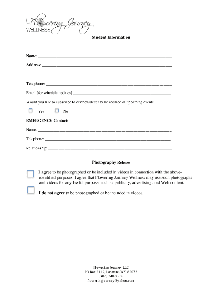 Student Informational: Address: Telephone: Email for schedule updates Would you like to subscribe to our newsletter to be notified of upcoming events? YesNoEMERGENCY Contact: Name: Telephone: Relationship: