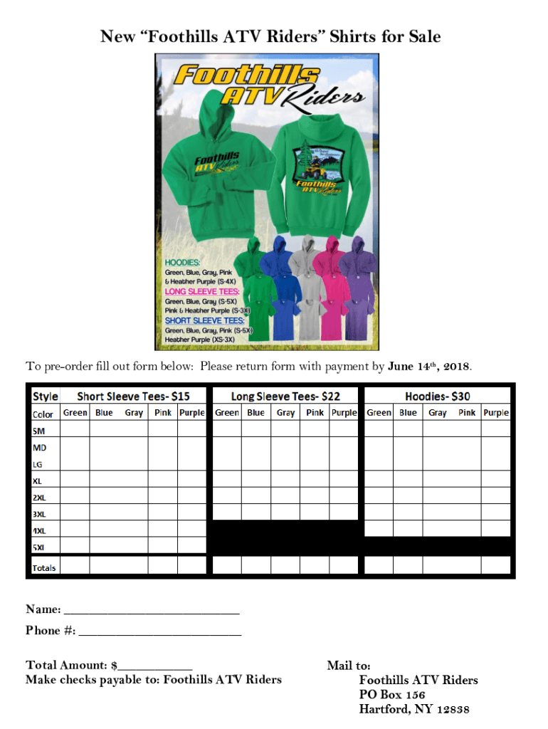 New Foothills ATV Riders Shirts for Salto preorder fill out form below: Please return form with payment by June 14th, 2018. Name: Phone #: Total Amount: $ Make checks payable to: Foothills ATV Riders