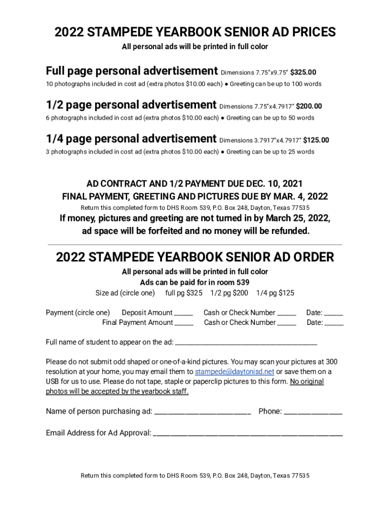 2022 STAMPEDE YEARBOOK SENIOR AD PRICES All personal ads will be printed in full colorful page personal advertisement Dimensions 7.75×$9.75325.00 10 photographs included in cost ad (extra photos