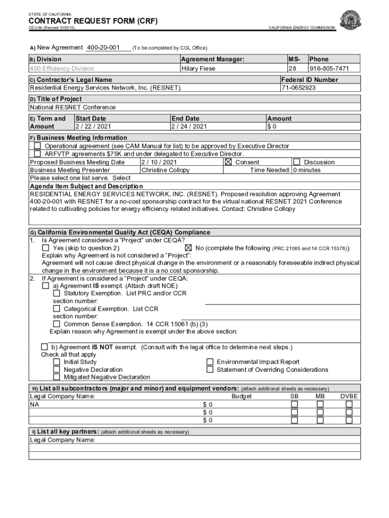 STATE OF CALIFORNIACONTRACT REQUEST FORM (CRF) CEC94 (Revised 10/2015)A)New Agreement 40020001Division 400 Efficiency Division)CALIFORNIA ENERGY COMMISSION(To be completed by CGL Office)Agreement