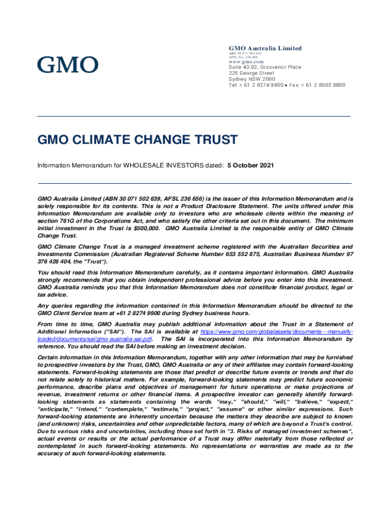 GMO Australia Limited ABN 30 071 502 639 ADSL No. 236 656www.gmo.com Suite 43.02, Grosvenor Place 225 George Street Sydney NSW 2000 Tel: + 61 2 8274 9900 Fax: + 61 2 8003 8800GMO CLIMATE CHANGE TRUST