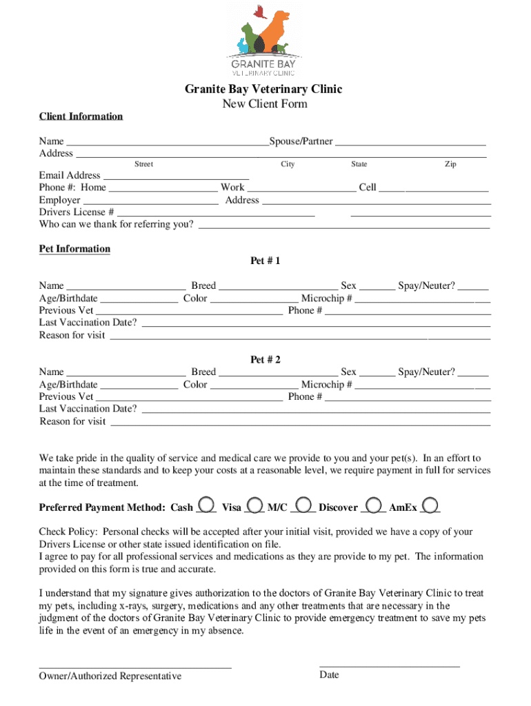 Granite Bay Veterinary Clinic New Client Form Client Information Name Spouse/Partner Address StreetCityStateZipEmail Address Phone #: Homework Cell Employer Address Driver's License # Who can we thank