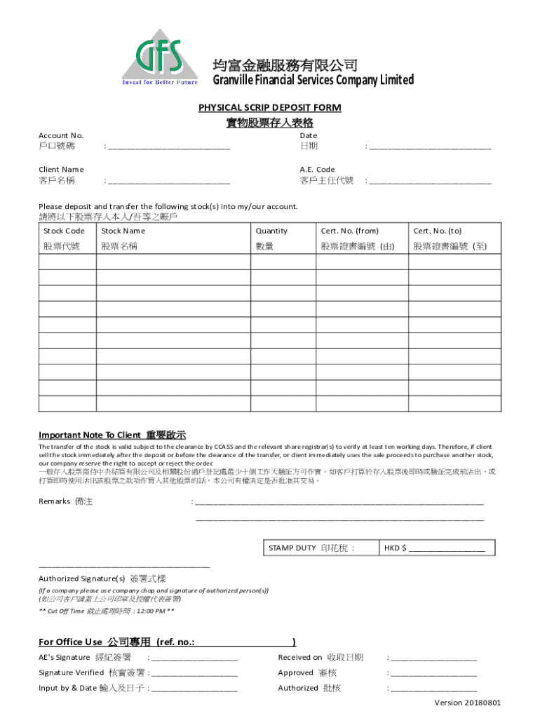 Granville Financial Services Company Limited PHYSICAL SCRIP DEPOSIT FORM Account No. Date : Client Name : A.E. Code : Please deposit and transfer the following stock(s) into my/our account. / Stock