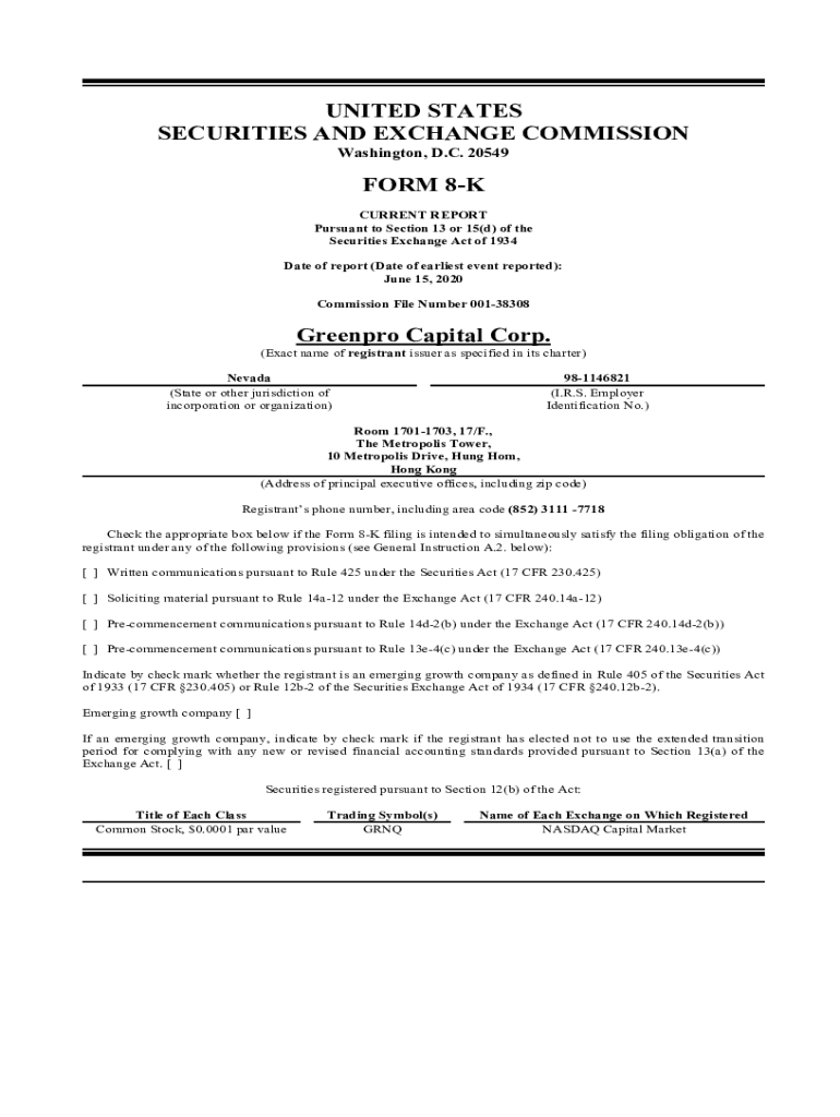 Get the free Greenpro Capital Corp. (Form: 8-K, Received: 06/05/2020 06 ...