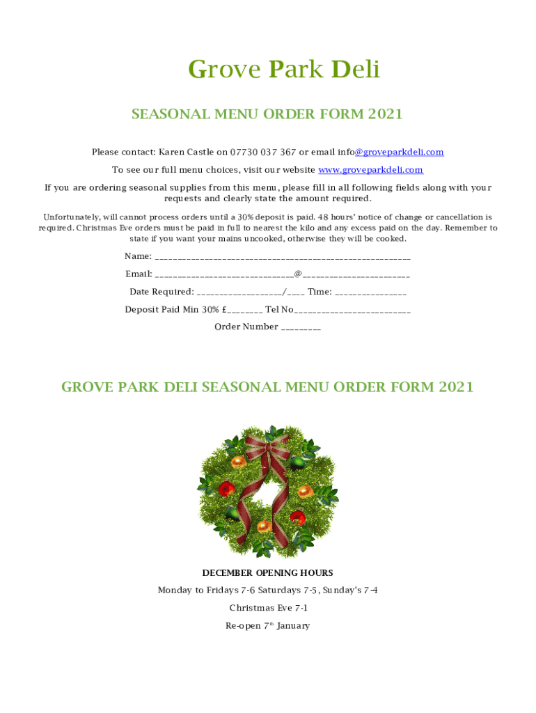 Grove Park Deli SEASONAL MENU ORDER FORM 2021 Please contact: Karen Castle on 07730 037 367 or email info@groveparkdeli.com To see our full menu choices, visit our website www.groveparkdeli.com If