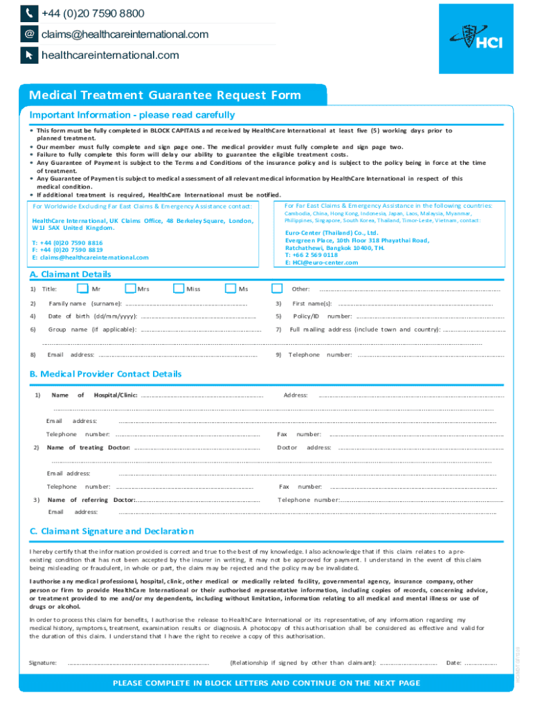 +44 (0)20 7590 8800 claims@healthcareinternational.com healthcare international. Commercial Treatment Guarantee Request Form Important Information please read carefully This form must be fully completed