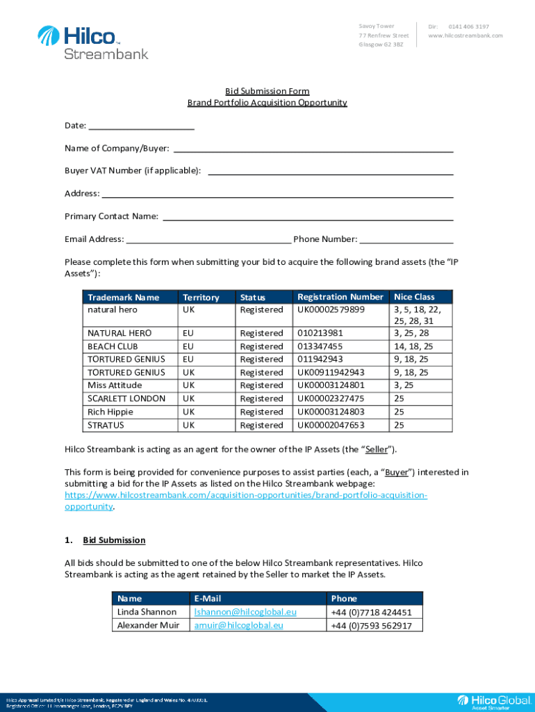 Savoy Tower 77 Renfrew Street Glasgow G2 3BZDir: 0141 406 3197 www.hilcostreambank.comBid Submission Form Brand Portfolio Acquisition Opportunity Date: Name of Company/Buyer: Buyer VAT Number (if