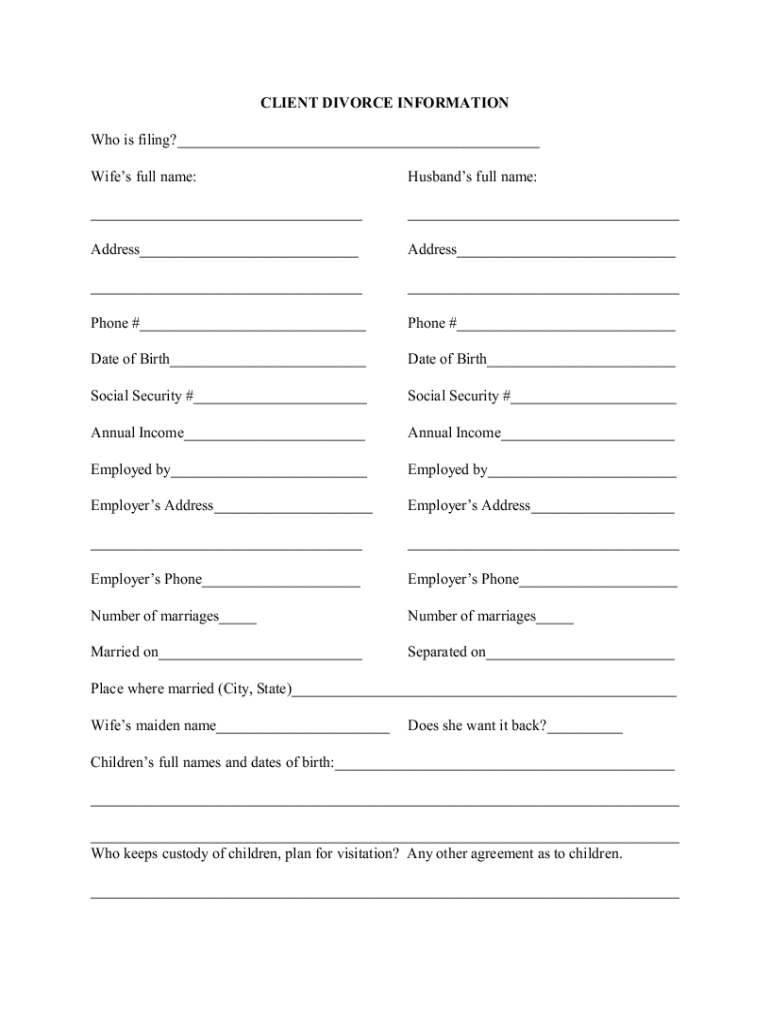 CLIENT DIVORCE INFORMATION Who is filing? Wife full name:Husbands full name: Address Phone # Phone # Date of Birth Date of Birth Social Security # Social Security # Annual Income Employed by Employers