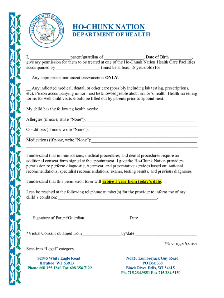 CHUNK NATIONDEPARTMENT OF HEALTH, parent/guardian of, Date of Birth, give my permission for them to be treated at one of the Ho Chunk Nation Health Care Facilities accompanied by (must be at least