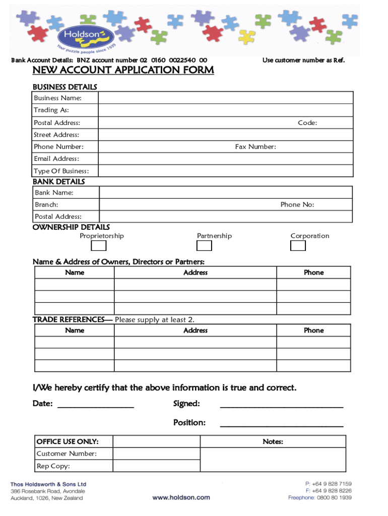 Bank Account Details: BNZ account number 02 0160 0022540 00Use customer number as Ref. NEW ACCOUNT APPLICATION FORM BUSINESS DETAILS Business Name: Trading As: Postal Address:Code:Street Address: