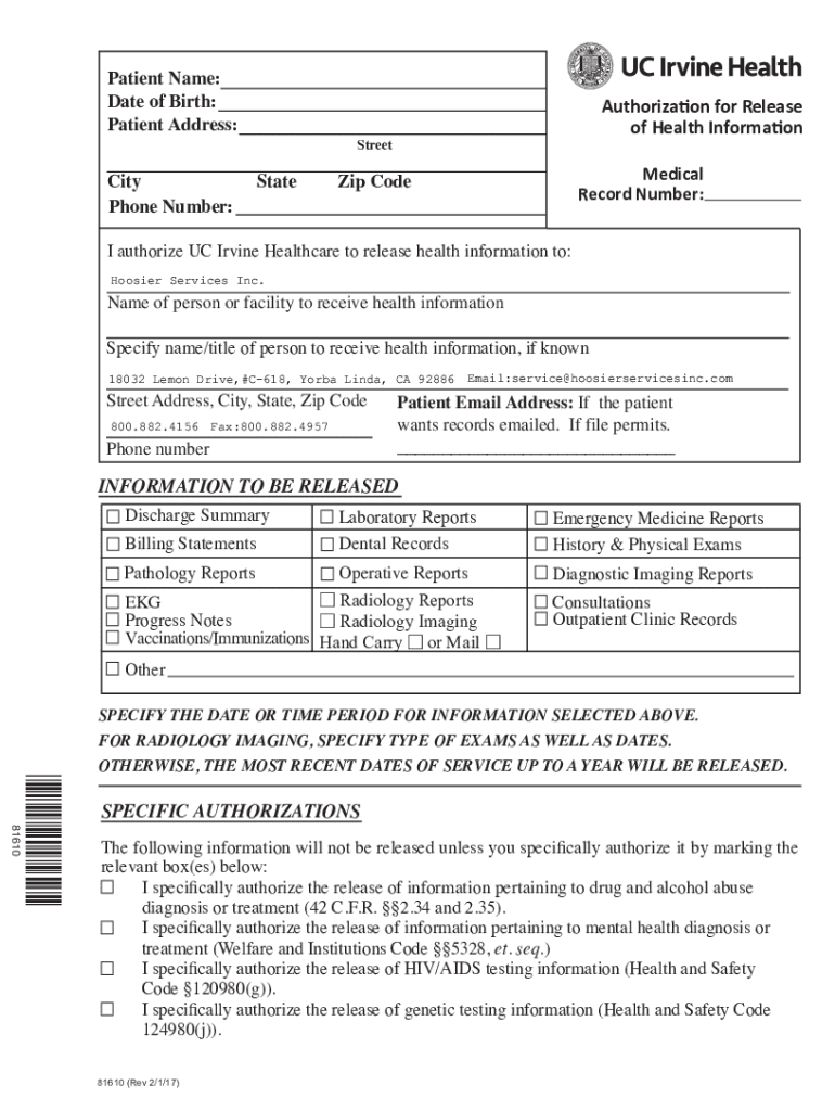 Patient Name: Date of Birth: Patient Address: City Phone Number:Z, /StreetStateD Zip Code, DXWKRUL H8&,SYLPH+HDOWKFDUHWRUHOHDVHKHDOWKLQIRUPDWLRQWR Hoosier Services Inc. Name of person or facility