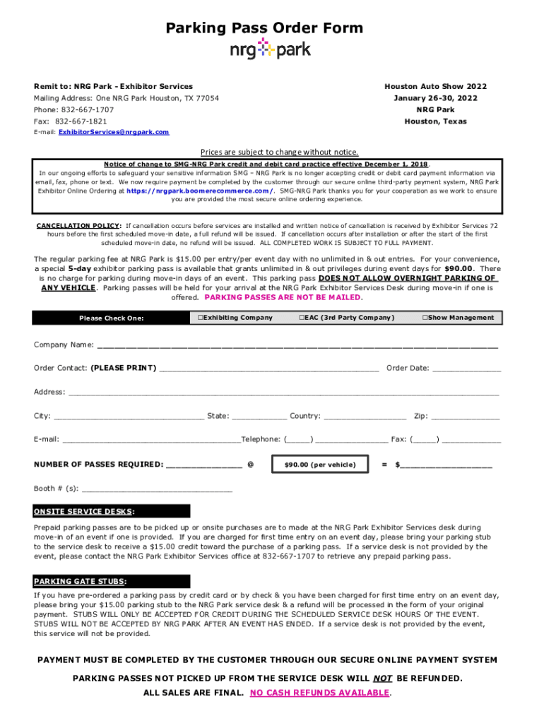 Parking Pass Order Forrest to: NRG Park Exhibitor Services Houston Auto Show 2022Mailing Address: One NRG Park Houston, TX 77054January 2630, 2022Phone: 8326671707NRG Parkway: 8326671821Houston, TexasEmail: