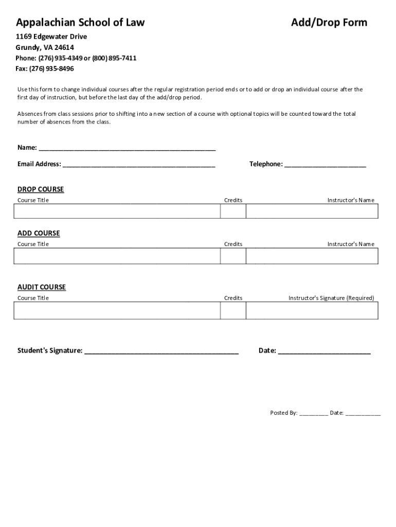 Appalachian School of Award/Drop Form1169 Edgewater Drive Grundy, VA 24614 Phone: (276) 9354349 or (800) 8957411 Fax: (276) 9358496 Use this form to change individual courses after the regular registration