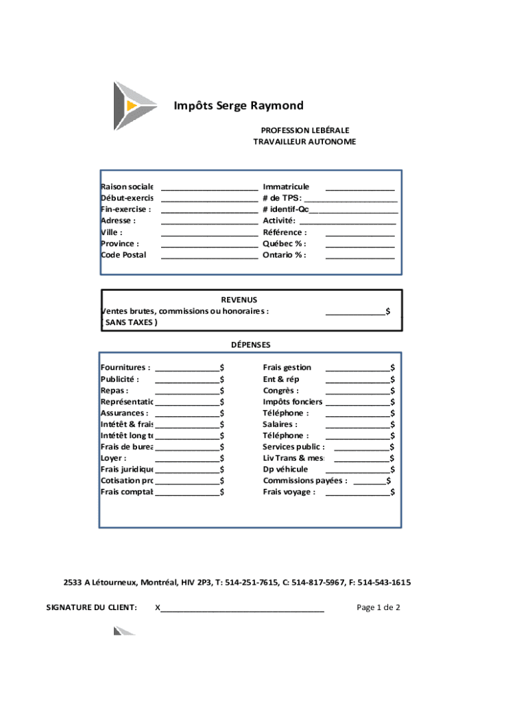 Imps Serge Raymond PROFESSION FEBRILE TRAVAILED AUTONOMERaison social : Dbutexercise : Fin exercise : Address : Villa : Province : Code Postal Immatricule # de TPS: # identify Activity: French : Quebec