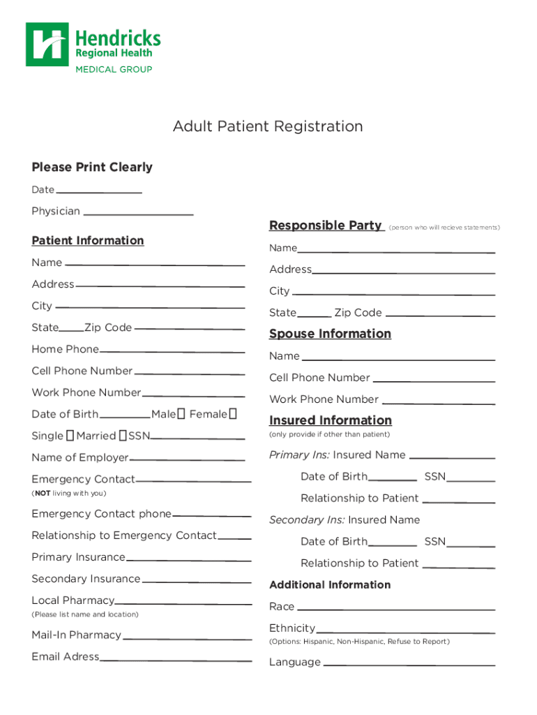 Adult Patient Registration Please Print Clearly DatePhysicianResponsible PartyPatient InformationNameNameAddressAddressCityCity Statesman Zip CodeNameCell Phone Numbered Phone NumberWork Phone Number