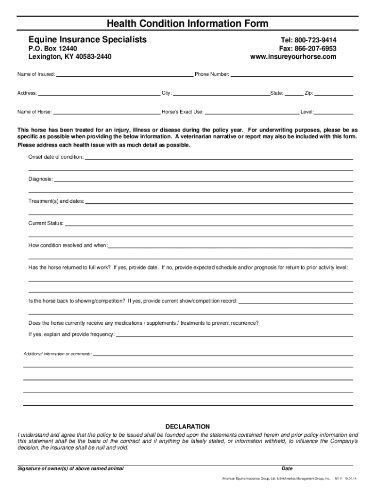 Health Condition Information Form Equine Insurance Specialists: 8007239414 Fax: 8662076953 www.insureyourhorse.comP. O. Box 12440 Lexington, KY 405832440 Name of Insured:Phone Number:Address:City:Name