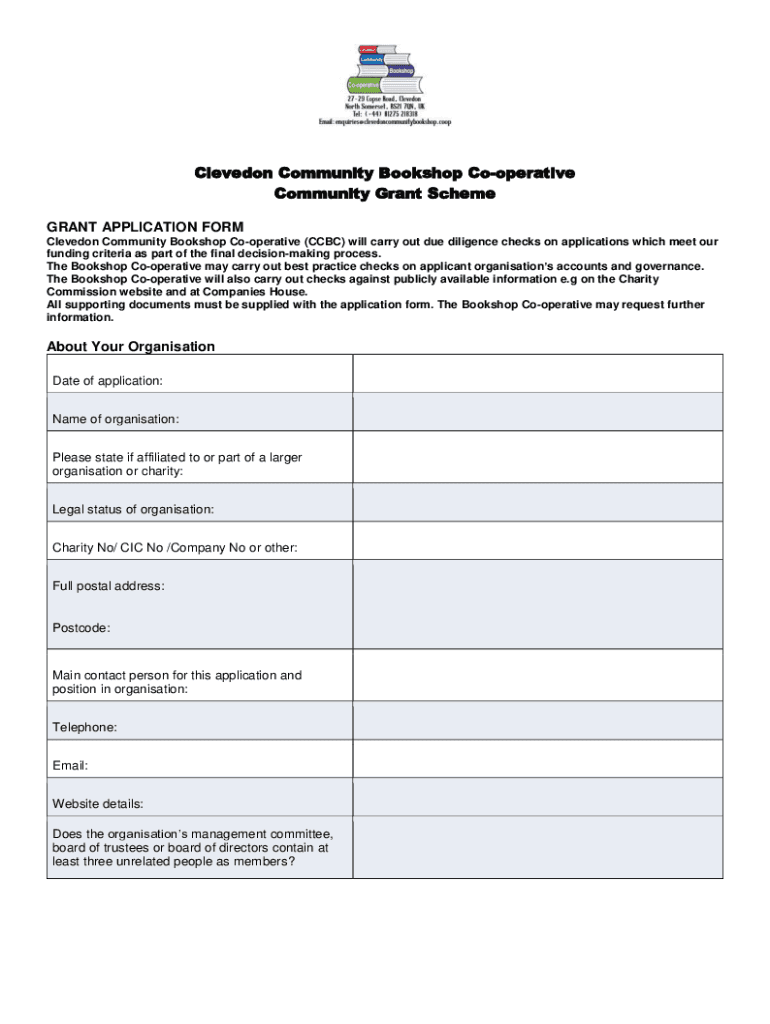 Eleven Community Bookshop Cooperative Community Grant Scheme GRANT APPLICATION FORM Eleven Community Bookshop Cooperative (CCBC) will carry out due diligence checks on applications which meet our