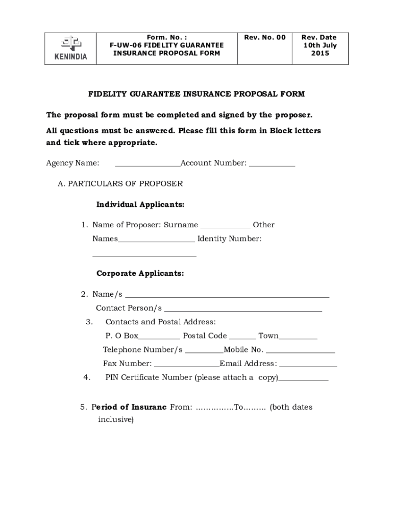 Form. No. FUW06 FIDELITY GUARANTEE INSURANCE PROPOSAL FORM Rev. No. 00Rev. Date 10th July 2015FIDELITY GUARANTEE INSURANCE PROPOSAL FORM The proposal form must be completed and signed by the proposer.