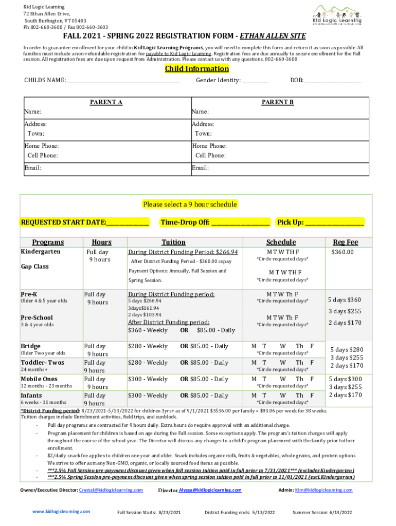 Kid Logic Learning 72 Ethan Allen Drive, South Burlington, VT 05403 pH 8026603600 / Fax 8026603603FALL 2021 SPRING 2022 REGISTRATION FORM ETHAN ALLEN Stein order to guarantee enrollment for your child