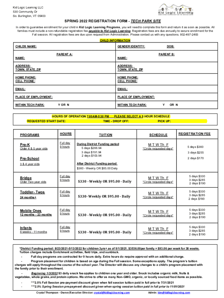 Kid Logic Learning LLC 530 Community Dr So. Burlington, VT 05403SPRING 2022 REGISTRATION FORM TECH PARK SITE In order to guarantee enrollment for your child in Kid Logic Learning Programs, you will