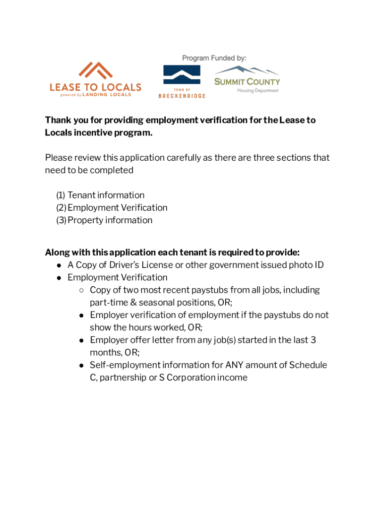 Thank you for providing employment verification for the Lease to Locals incentive program. Please review this application carefully as there are three sections that need to be completed (1) Tenant