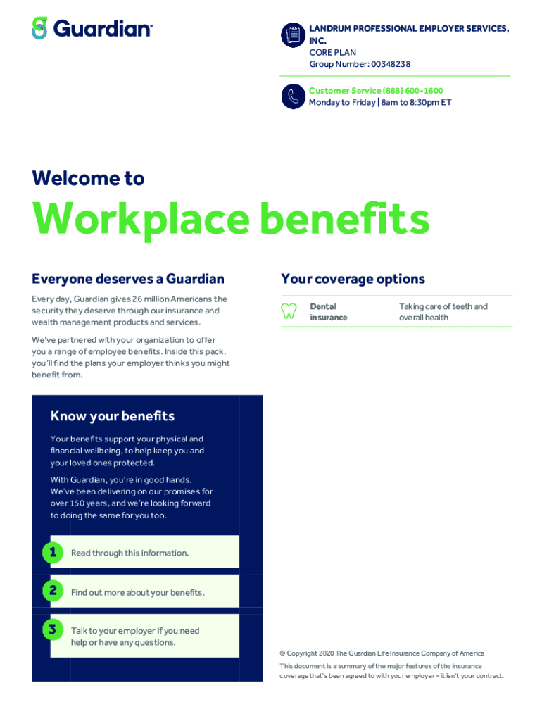 LANDRY PROFESSIONAL EMPLOYER SERVICES, INC. CORE PLAN Group Number: 00348238Customer Service (888) 6001600 Monday to Friday 8am to 8:30pm Welcome workplace benefits Everyone deserves a Guardian Every