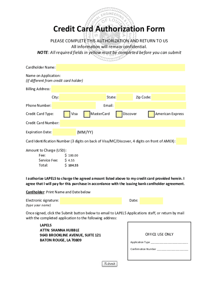 Credit Card Authorization Form PLEASE COMPLETE THIS AUTHORIZATION AND RETURN TO US All information will remain confidential. NOTE: All required fields in yellow must be completed before you can submit