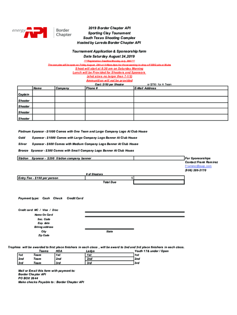 2019 Border Chapter API Sporting Clay Tournament South Texas Shooting Complex Hosted by Laredo Border Chapter API Tournament Application & Sponsorship form Date Saturday, August 24, 2019 ****Registration
